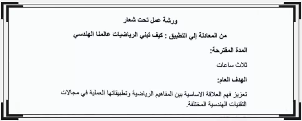دعوة للمشاركة في ورشة عمل تحت شعار (من المعادلة إلى التطبيق : كيف تبني الرياضيات عالمنا الهندسي).